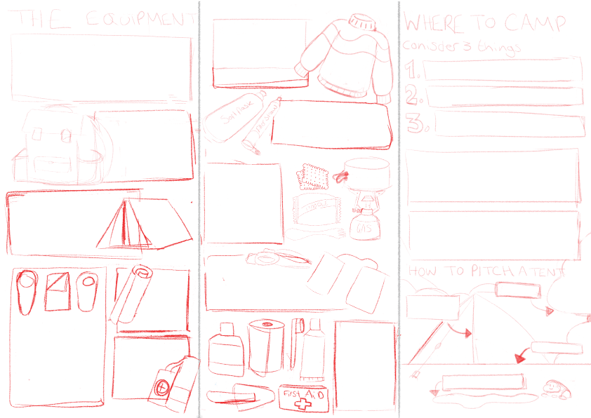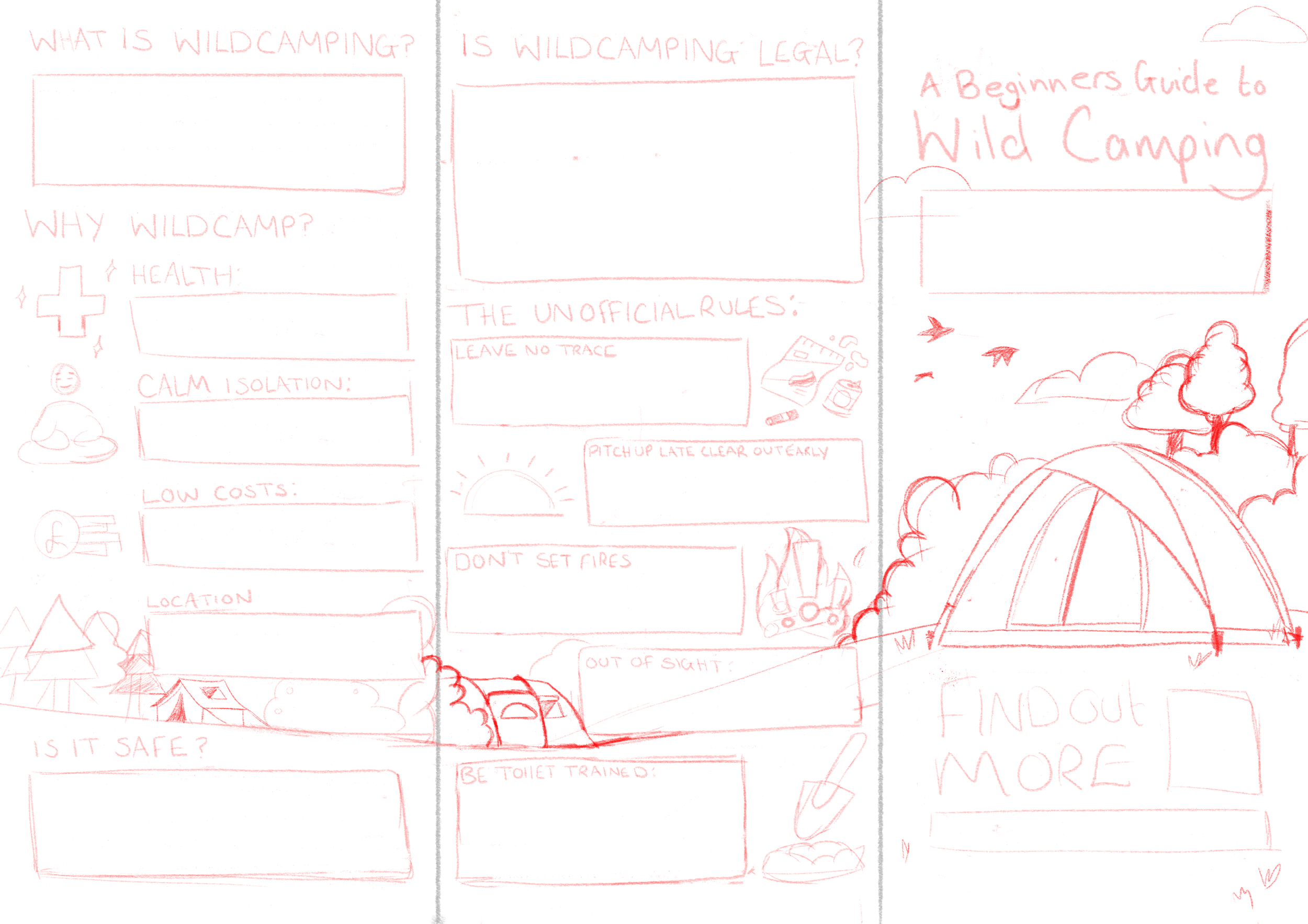 I began by collecting all the relevant information about wild camping, organising it into categories with headings and then planning the reading order with consideration to how much space was available on the flyer.