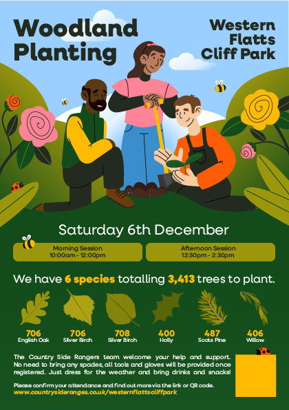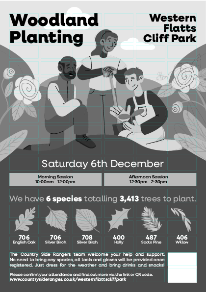 To help promote a tree planting event at Westen Flatts Cliff Park, I volunteered to design a flyer to spread the word and encourage people to sign up as volunteers. My goal was to create a visually engaging design that clearly communicated the purpose of the event while making it easy for people to understand how to get involved. I focused on bold, eye-catching illustrations and clear typography to draw attention, with a simple layout that highlighted the date, time, and sign-up information. The flyer was shared across local community channels, helping to attract volunteers and support the event’s success.